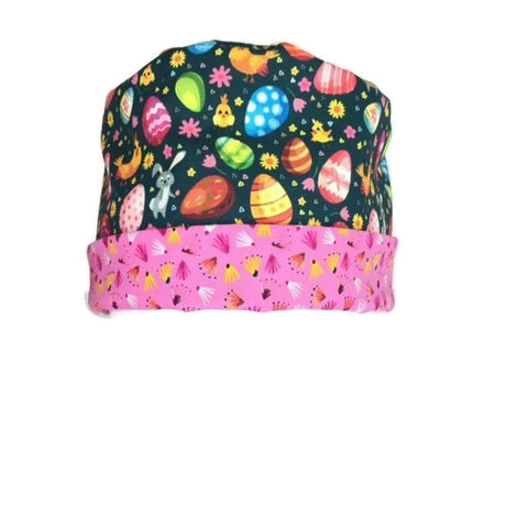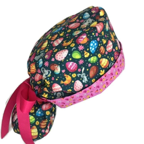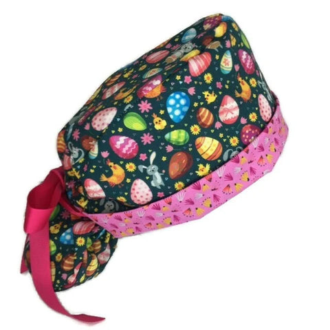 A perfect scrub hat for longer hair. There's a pouch in the back to hold your ponytail. Ribbons on each side tie around the pouch and make a cute bow on top.